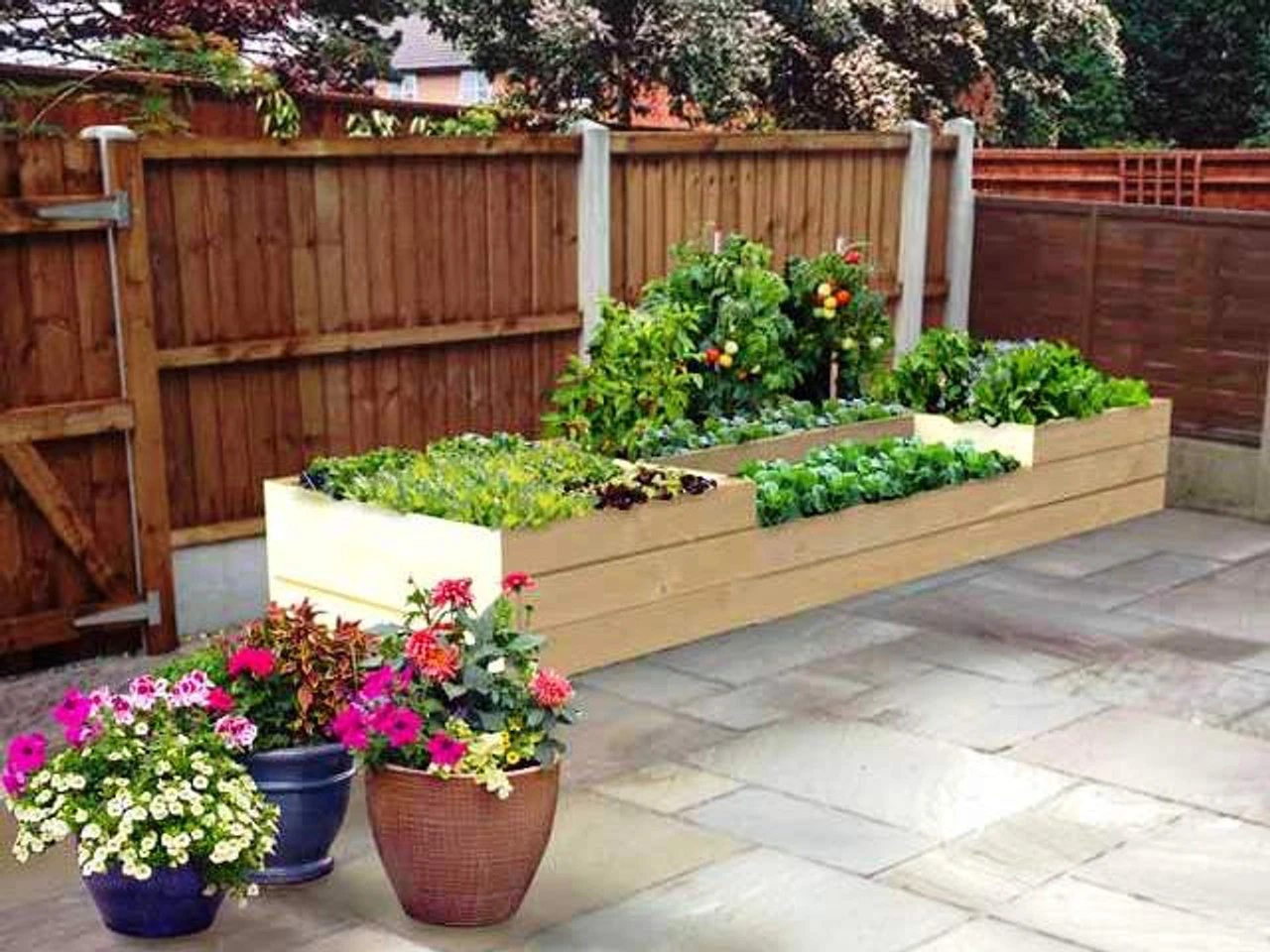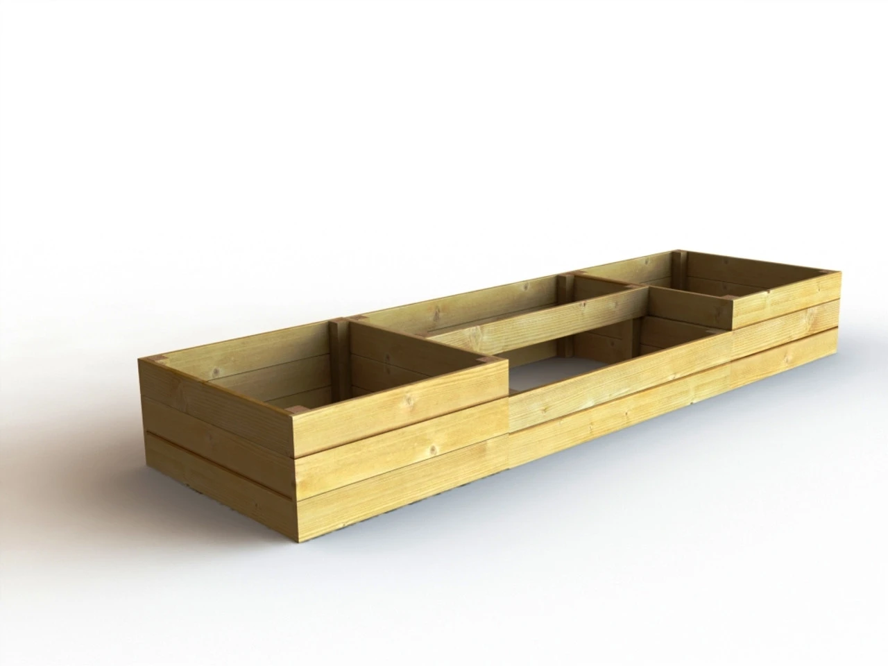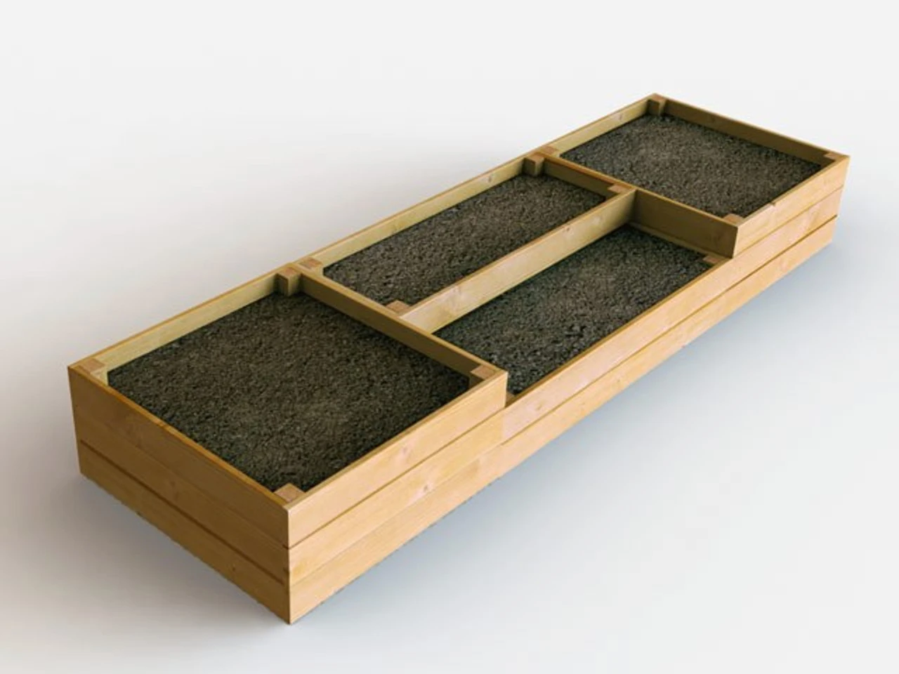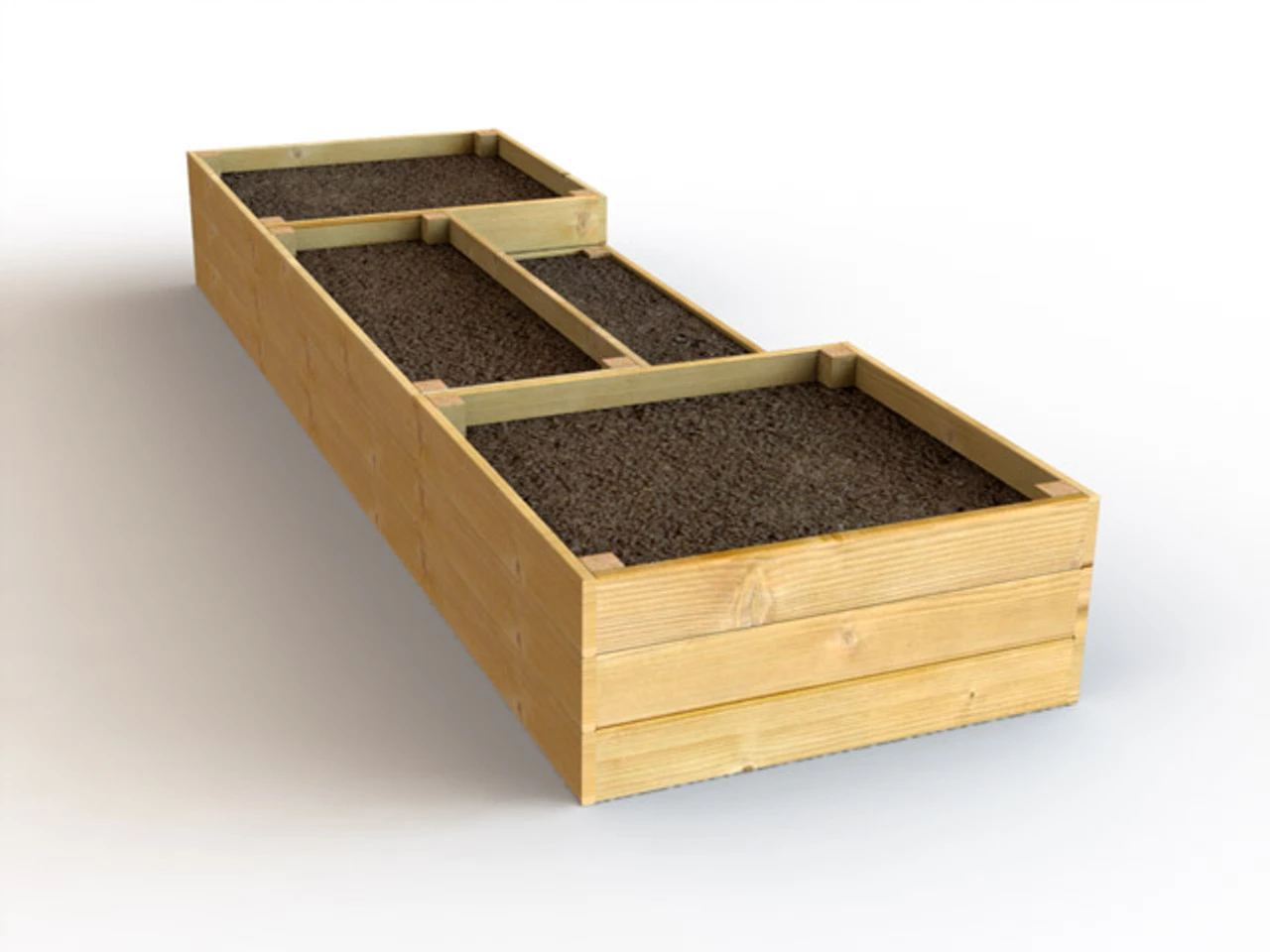 Our 2 tier urban garden raised bed kit is made up of a central 2 tier 180cm x 120cm section flanked by two 120cm square end beds. The sections are separate beds which are placed together to form this very attractive design.