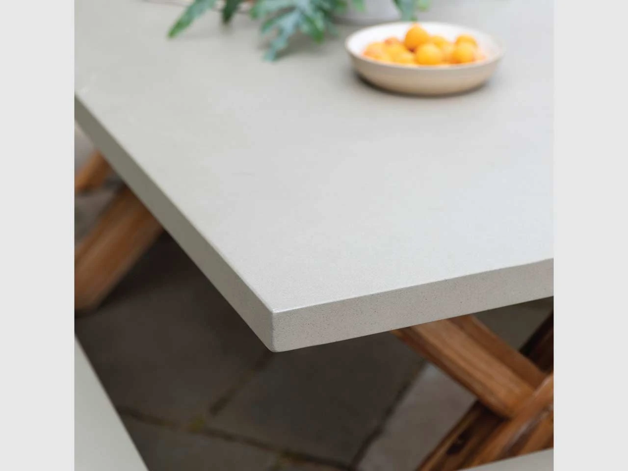 The table top and bench seats are made from a stylish grey colour polystone on modern criss-cross Acacia wooden legs. Some assembly is required but easy to follow instructions are provided. Remember to store under cover if stored outside for long periods of time or during the Winter months. Ensure that the furniture is completely dry before covering.