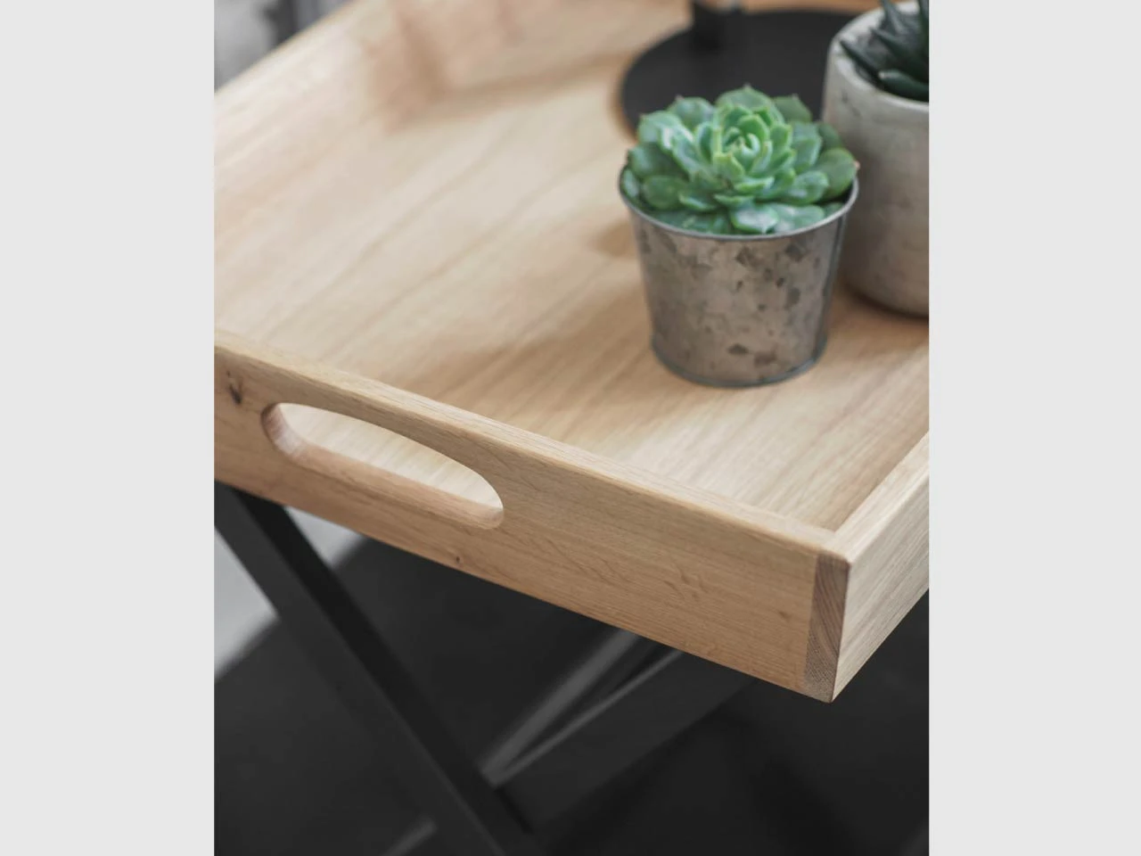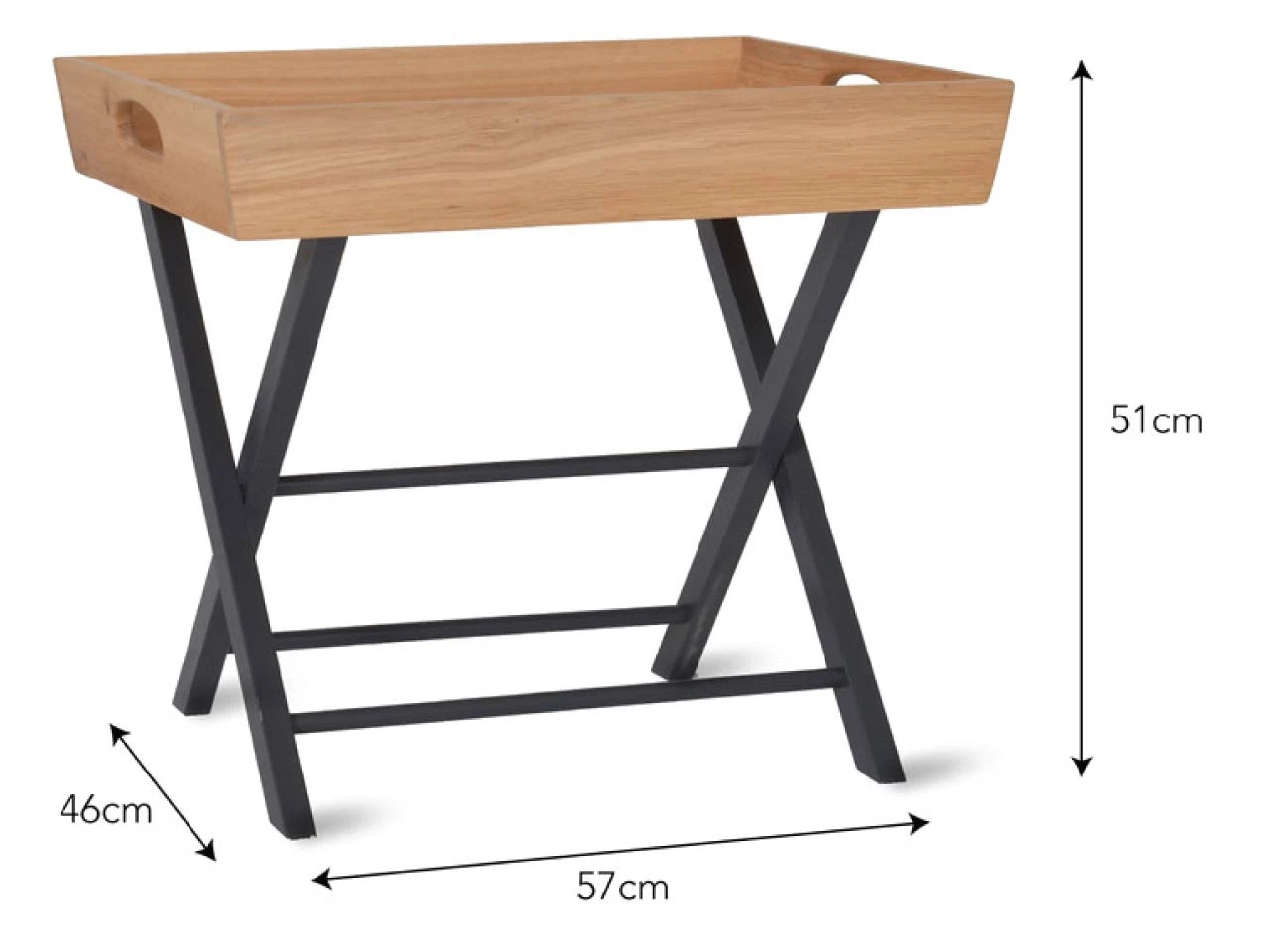 Crafted with Oak Veneer, the rectangular Butlers Side Table is a stylish place to lay your reading material, cup of coffee or whatever comforts you need close to hand. The tray has rustic shades and markings, while the cross-strut legs are finished with off-black Carbon. The table can be folded and stored away when not needed.