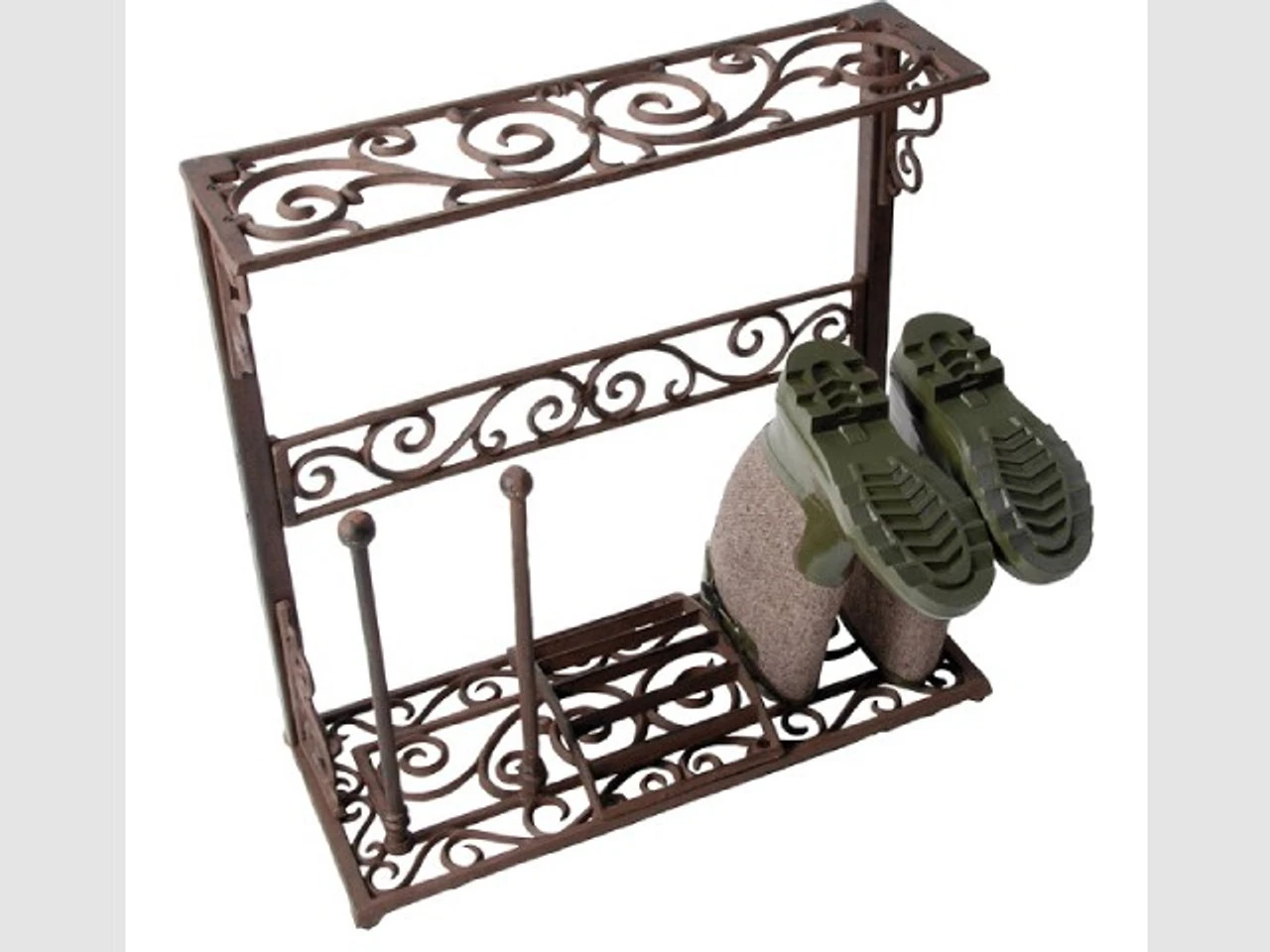 With its tasteful design, this boot and welly rack is both decorative and functional. A scraper in the middle allows you to remove hardened mud or soil, while there are four rubber feet on the underside of the rack to prevent scratching of floors. Four poles provide hanging space for two pairs of wellies or boots. The cast iron parts have each been hand cast according to age-old tradition and craftsmanship.