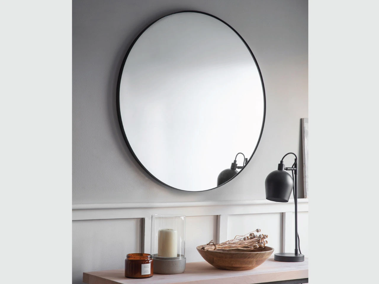 The Cherington round wall mirror is crafted in powder coated steel in black. The slim black framed mirror is the ideal way to make any room feel bigger with little effort. Designed for indoor use, this mirror is ideal for any bathroom or en-suite, hallways, and bedrooms.