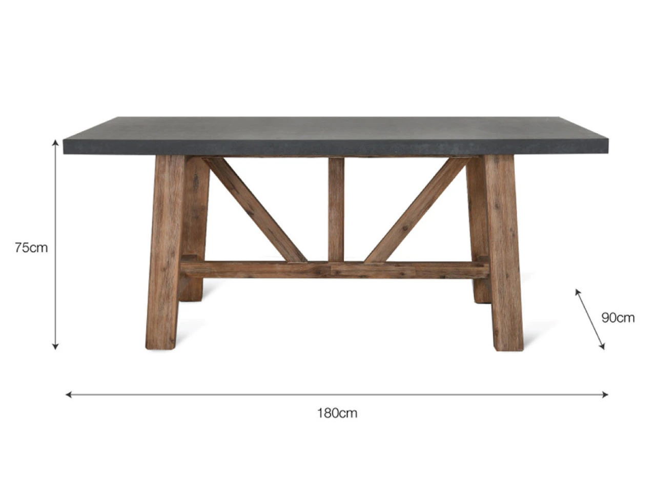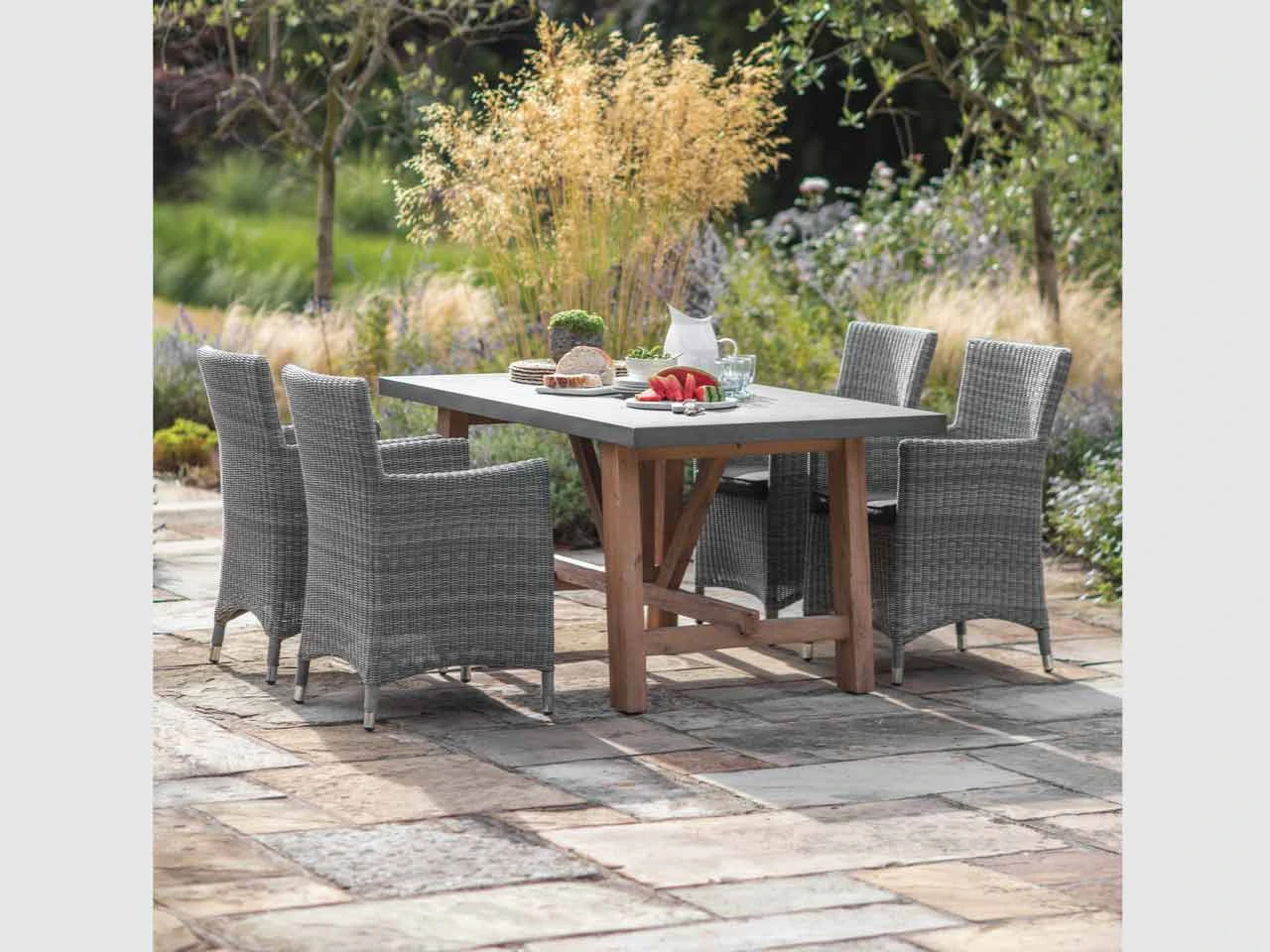 The fully weatherproof Chilson Table can be used in both indoor and outdoor dining areas. The legs are crafted from Acacia Wood with a cross bar design, while the beautiful Cement Fibre tabletop has a dark grey finish. The Chilson table can complement many different styles of furniture or decor, from rattan to traditional oak to painted metal.