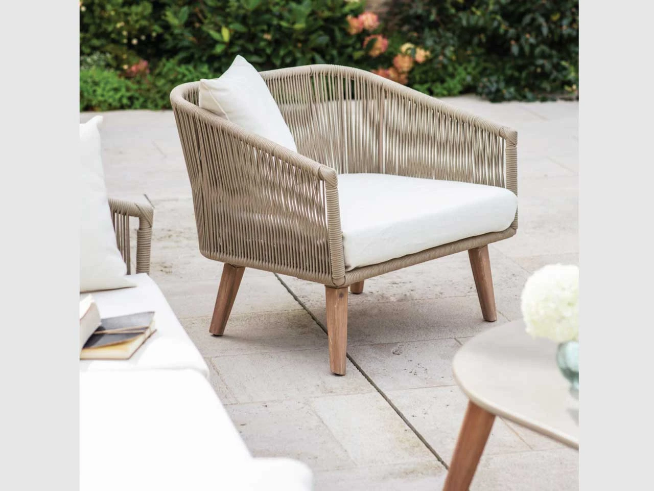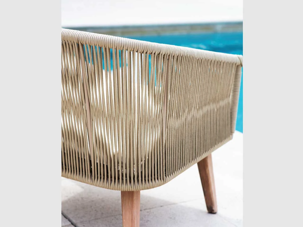 The Colwell sofa set combines elegance and comfort. A 3-seater sofa and two armchairs are crafted from Polyrope, with a lightweight but weatherproof design. The tapered legs meanwhile are made from Acacia wood. Completing the set is a curved coffee table, made from Poly-cement. 6 sofa scatter cushions and 1 cushion on each armchair come in a sophisticated off-white colour.