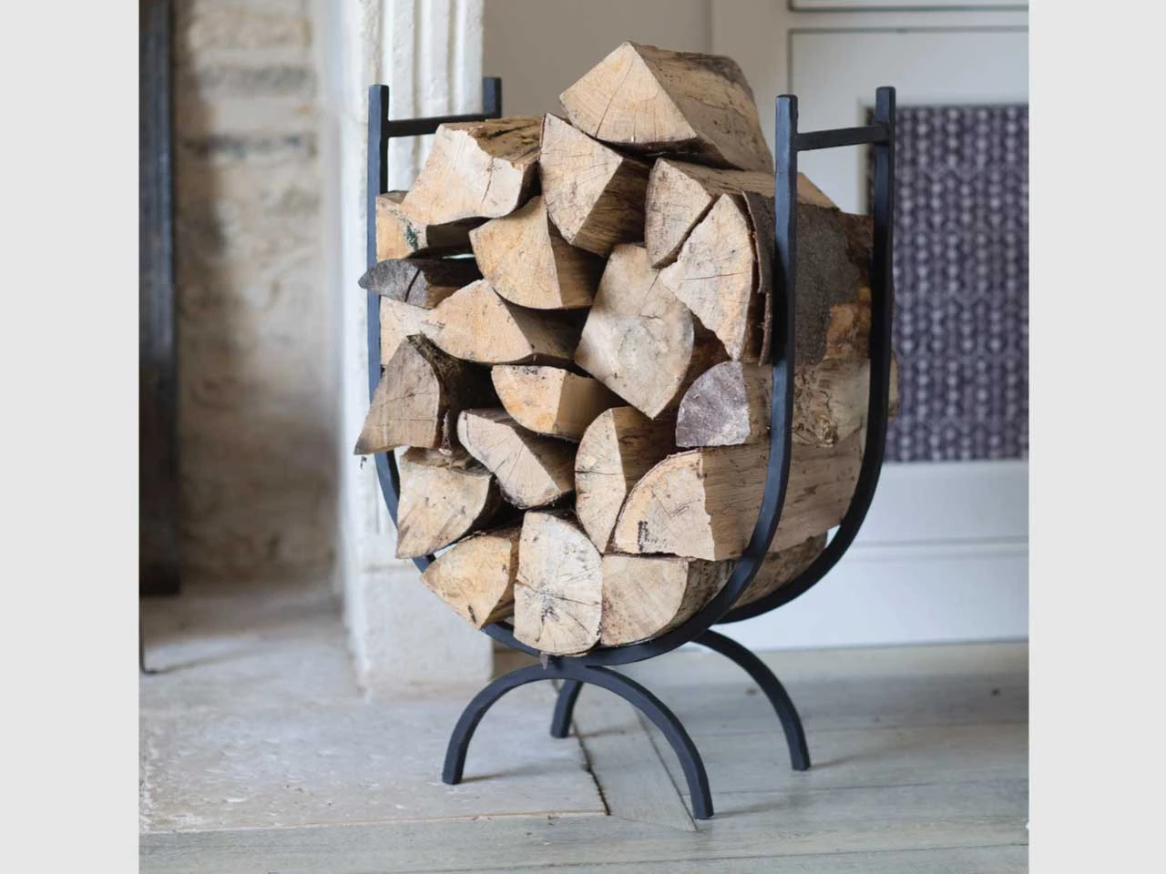 This large log holder is made from wrought iron in black. It has a stylish curved design that will look great when filled with logs in any fireplace. Keeping logs near the fire like this will minimise those trips out to fetch more, and will also dry out firewood a little if needed.