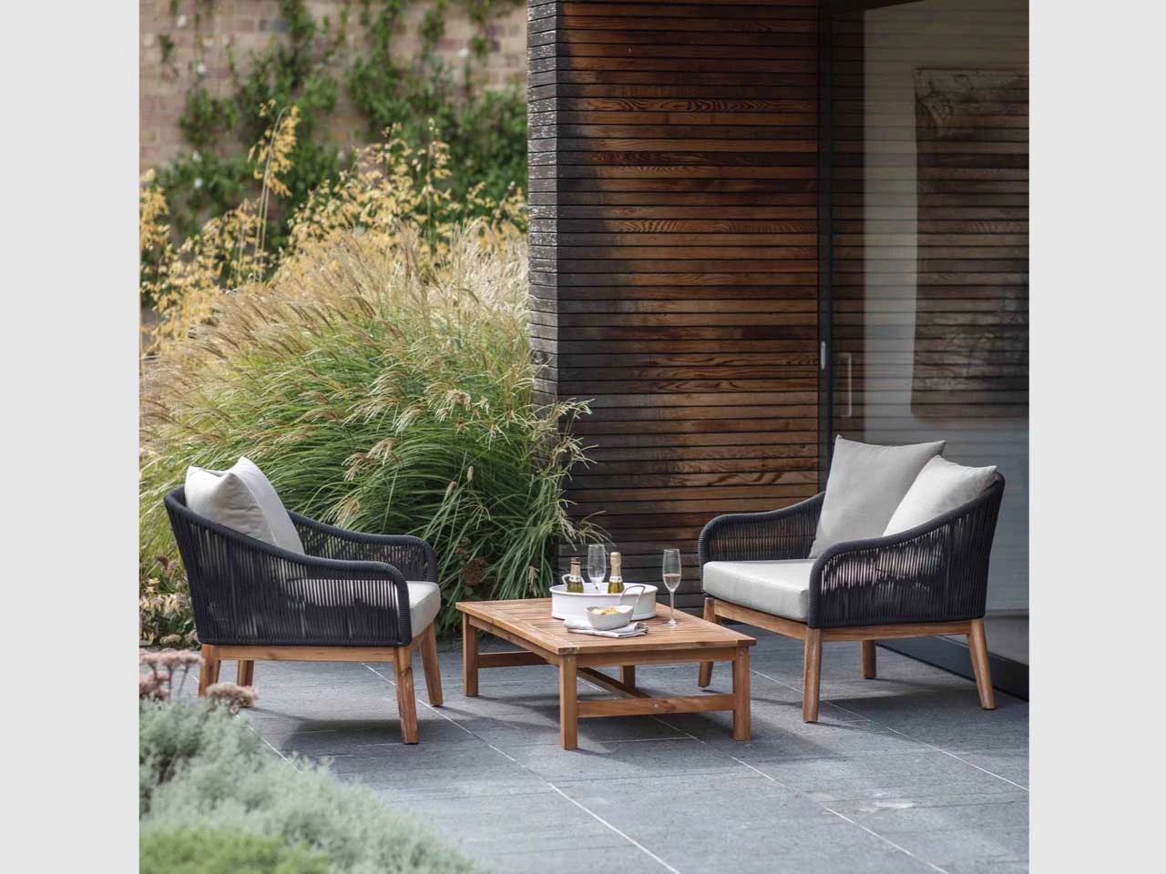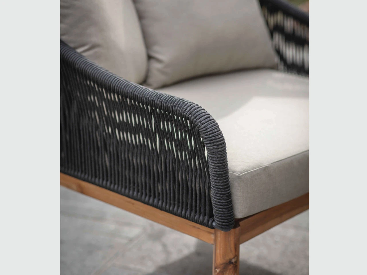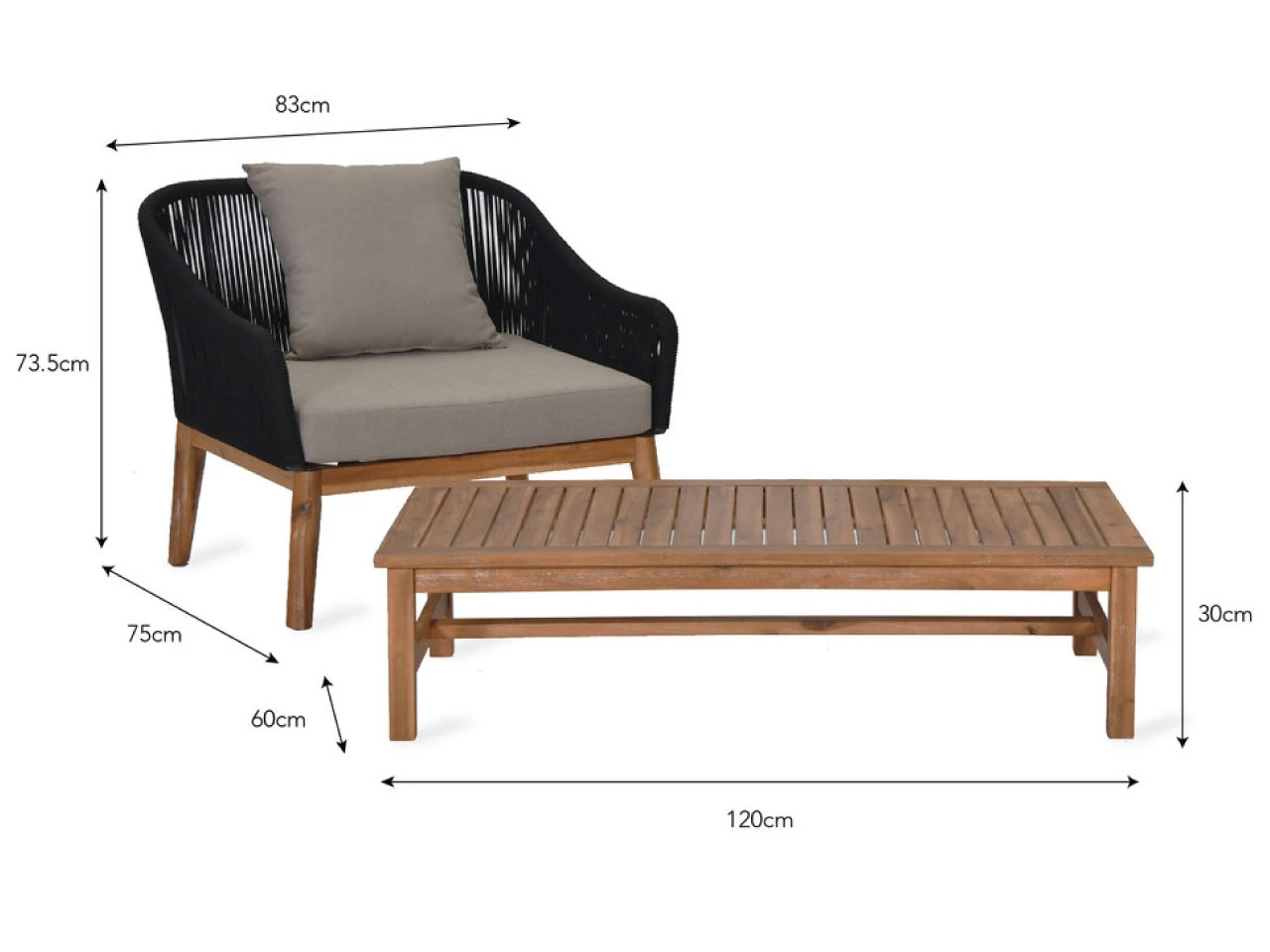 Perfect for summer evening lounging in the patio or garden, the Luccombe armchair set is crafted in black Polyrope with a lightweight design. The legs are made of Acacia Wood with a teak washed finish. Included in the set is a matching table. The set is suitable for outdoor use as well as indoors in the conservatory or kitchen.