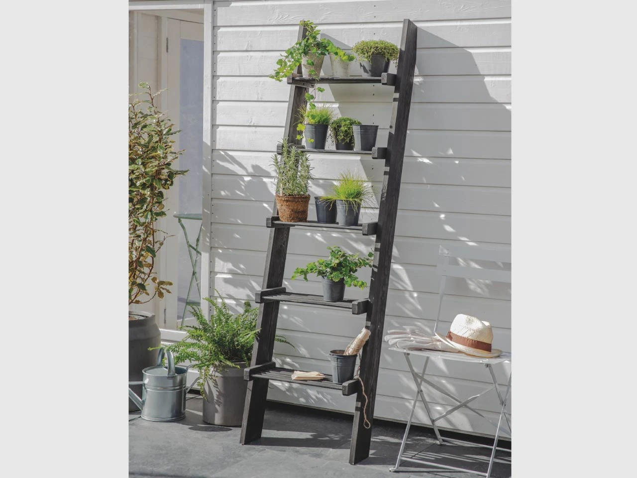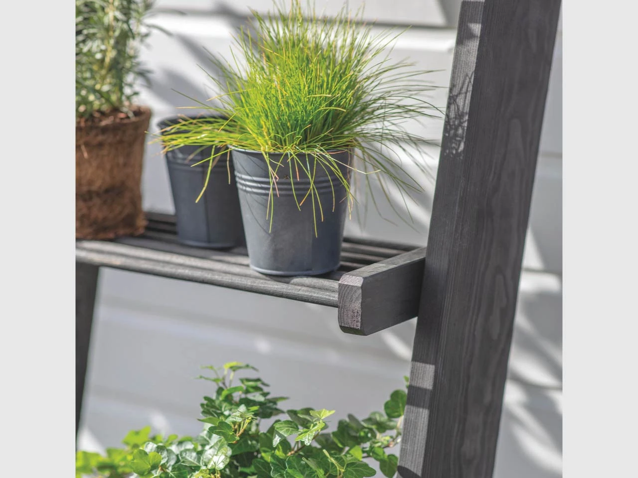 The Moreton shelf ladder has slatted shelves to aid drainage, it is made with spruce wood that has been treated, dipped, and stained black to last longer both inside and outdoors. Ideal for storing or displaying your favourite gardening plants or equipment. It has 2 polyester strips for fixing it to a wall or fence and prevent it from falling over. is sent out fully assembled meaning it is ready to use straight away.