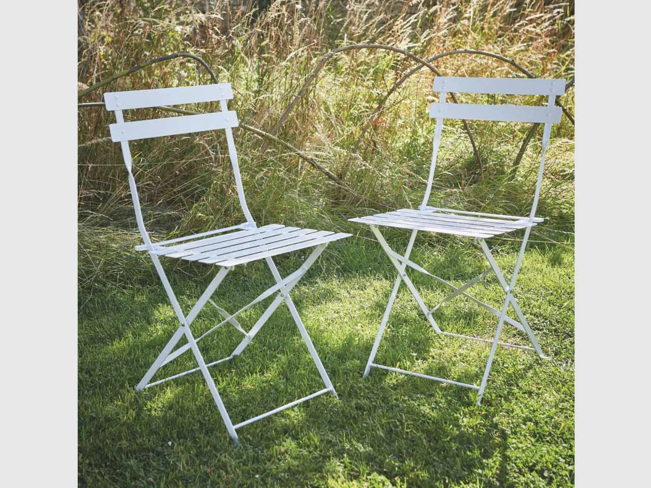 A pair of foldable steel Bistro chairs for indoor or outdoor use. They are weatherproof so are perfect for outdoor living, covering is recommended if the chairs are left out over the Winter months. Ensure that the furniture is completely dry before covering.