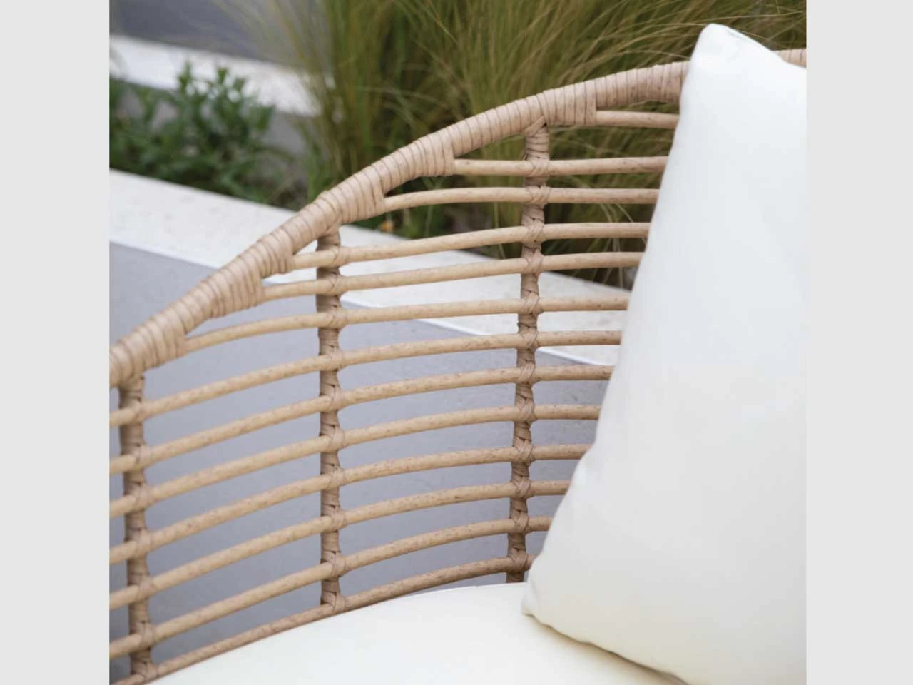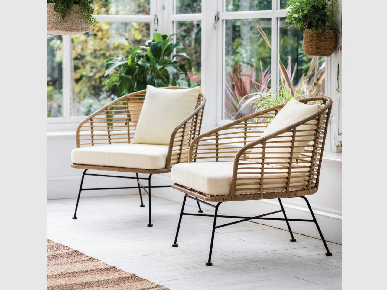 Pair of Hampstead weatherproof outdoor armchairs. These are made from PE bamboo which is a plastic weave that closely imitates the look of natural bamboo, on powder coated steel legs. Ideal for the patio, decking, conservatory and anywhere in the garden. Some assembly is required but easy to follow instructions are included. Remember to store under cover if stored outside for long periods of time or during the Winter months. Ensure that the furniture is completely dry before covering and store the cushions inside. Best cleaned with cold water and a mild soap. Cushions should be spot cleaned, but covers can be removed and hand washed in cool water, do not tumble dry.