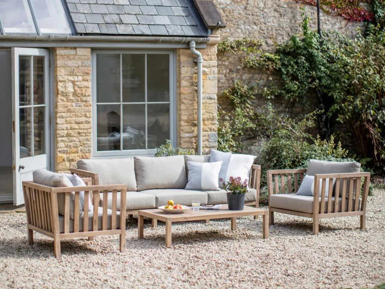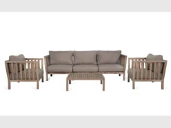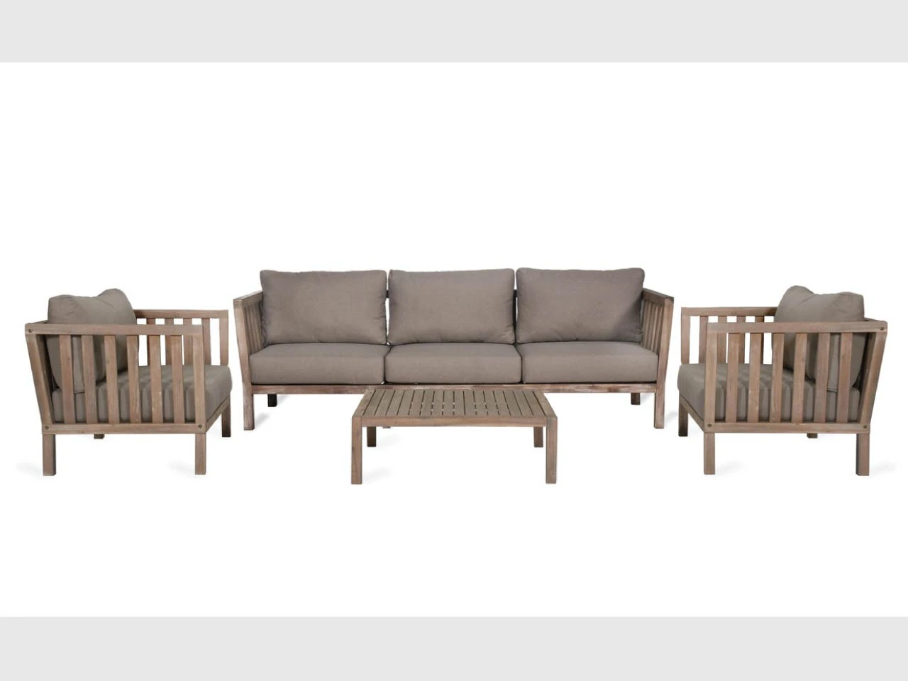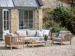 3 seater outdoor sofa from the Porthallow range. The sofa is made from acacia wood with a whitewash finish and has comfortable grey cushions. Perfect for outdoor living and garden parties, these sofas are also ideal for indoors use. These sofas are weatherproof but it is recommended to cover them or store indoors in the winter or during harsh weather.