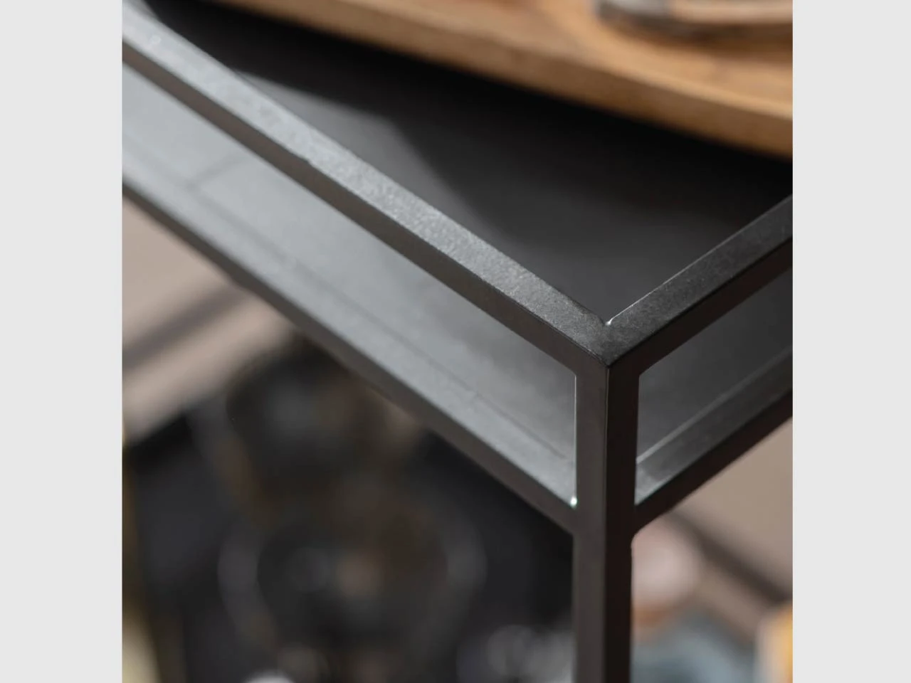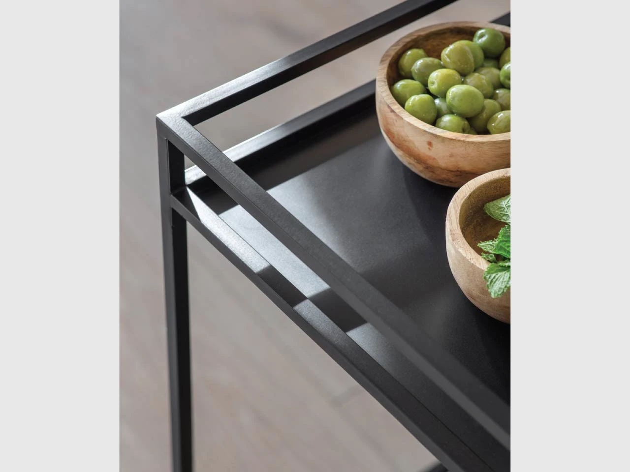The Portloe Drinks Trolley is a stylish way to serve and display beverages. Crafted from powder coated steel, the lower shelf can be used for mixers and ice while the top shelf can be used to pour and serve. For indoor use only, comes fully assembled.