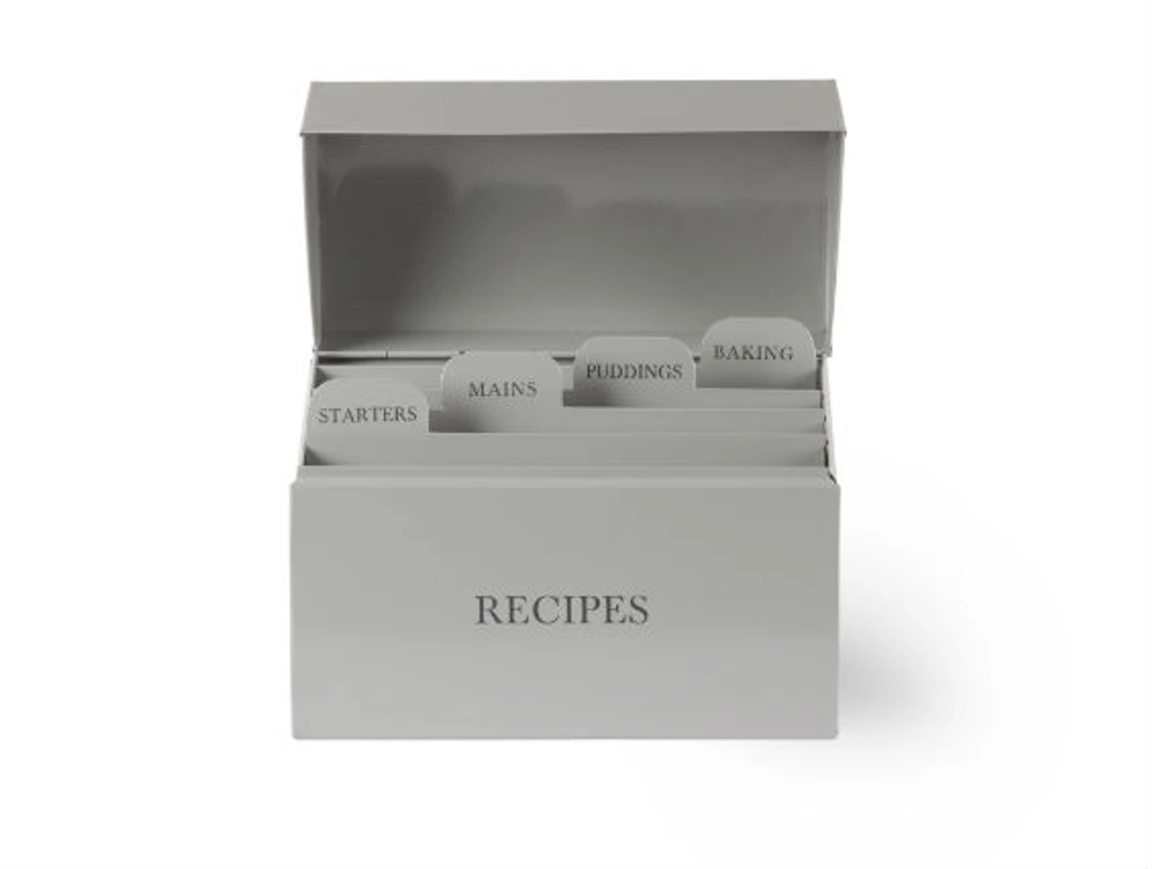 The Recipe Box is a powder coated steel tin in flint colour for storing all your favourite recipes. It comes with 4 removable dividers, labelled starters, mains, puddings and baking to make categorising or finding recipes even easier. The hinged lid comes attached and closes tightly to the long lasting and durable tin for maximum protection. An excellent gift idea.