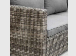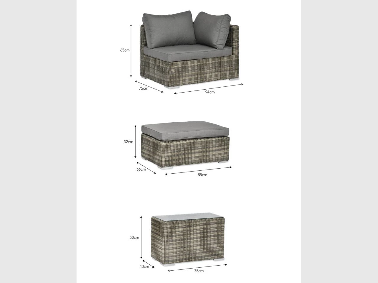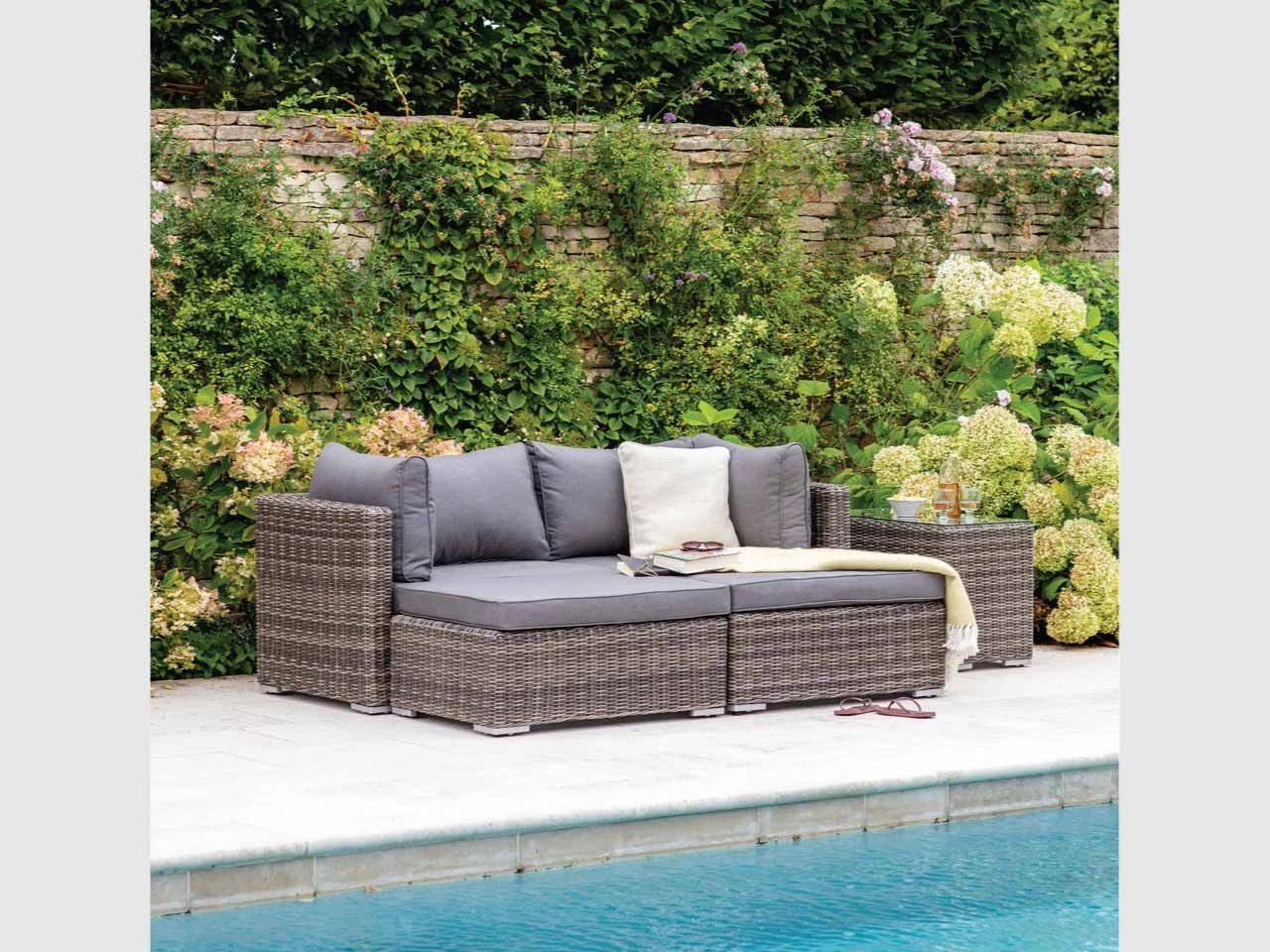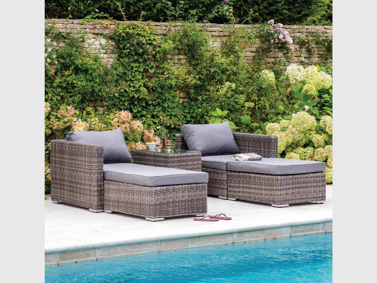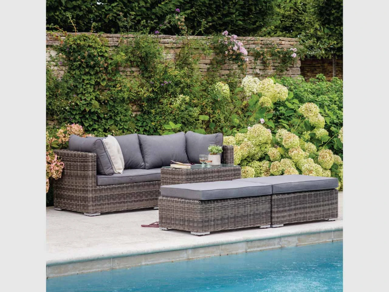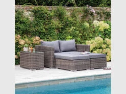 The Selborne double lounger set includes 2 armchairs, 2 ottomans and a coffee table, all matching and from the same range. These pieces are modular and can be easily re-arranged into a double lounger or sofa and long ottoman as often as needed, Clips are included to hold the modules together. The whole set is made from PE rattan, the table top is 5mm tempered glass, and the included cushions are all showerproof.