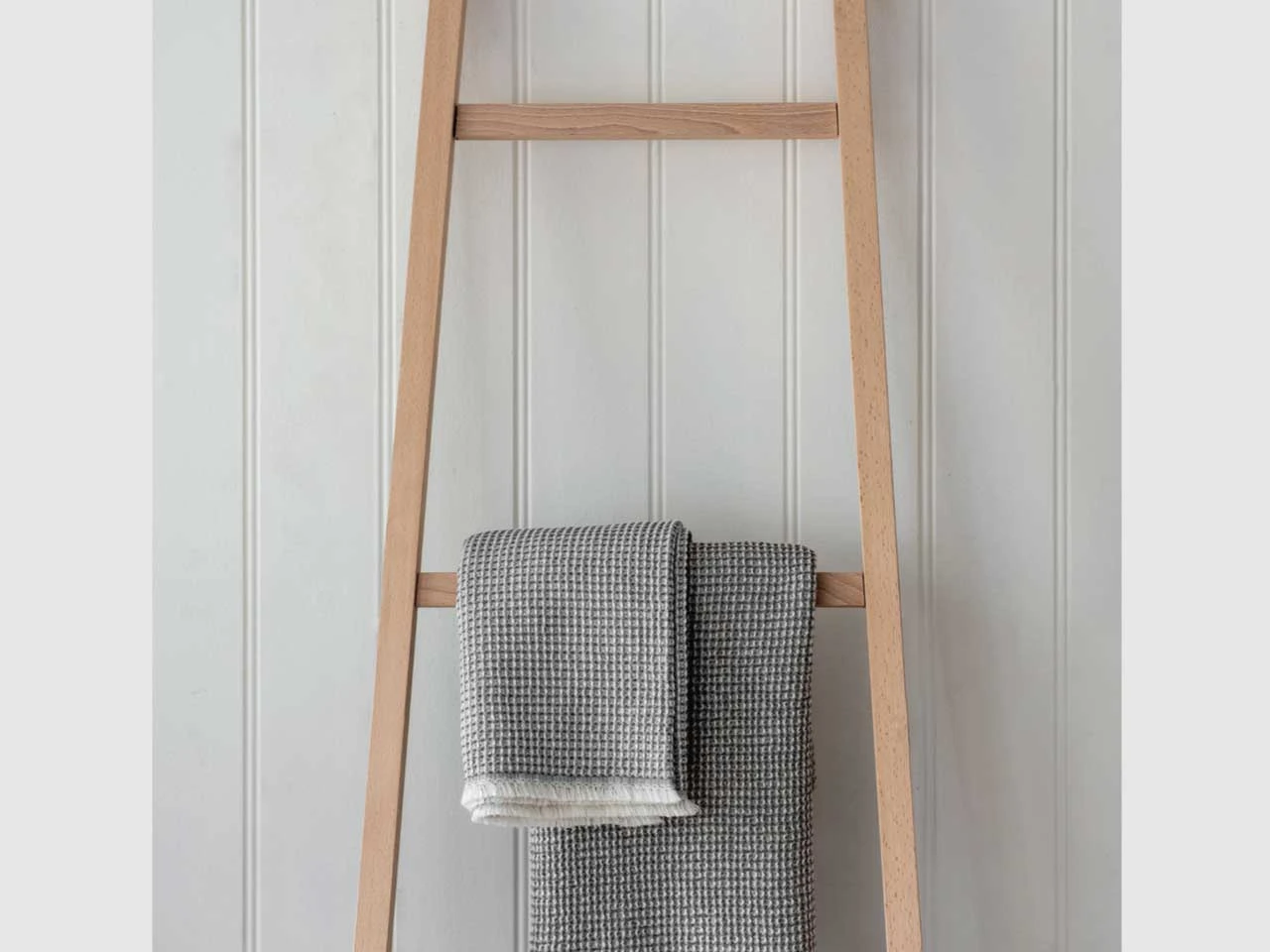 The Southbourne towel rack is a leaning towel rack with four rungs. Ideal for holding and displaying an entire set of towels. Made from Beech wood, it has a natural finish so can be painted or varnished. The rack has 2 safety straps for securing it to a wall and 2 pads on the top to keep it from marking the wall. The towel ladder arrives fully assembled and is designed for indoor use only.