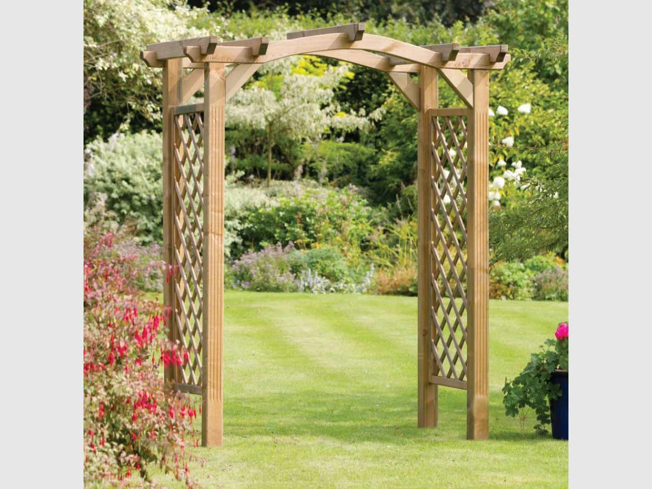 The Venus Arch enhances any garden walkway with its curved roof and diamond trellis side panels. Both aesthetically pleasing in its natural state, as well as covered in a variety of your favourite climbing plants. A strong structure with 90mm sized posts that can be secured in the ground with the optional fixing kit.