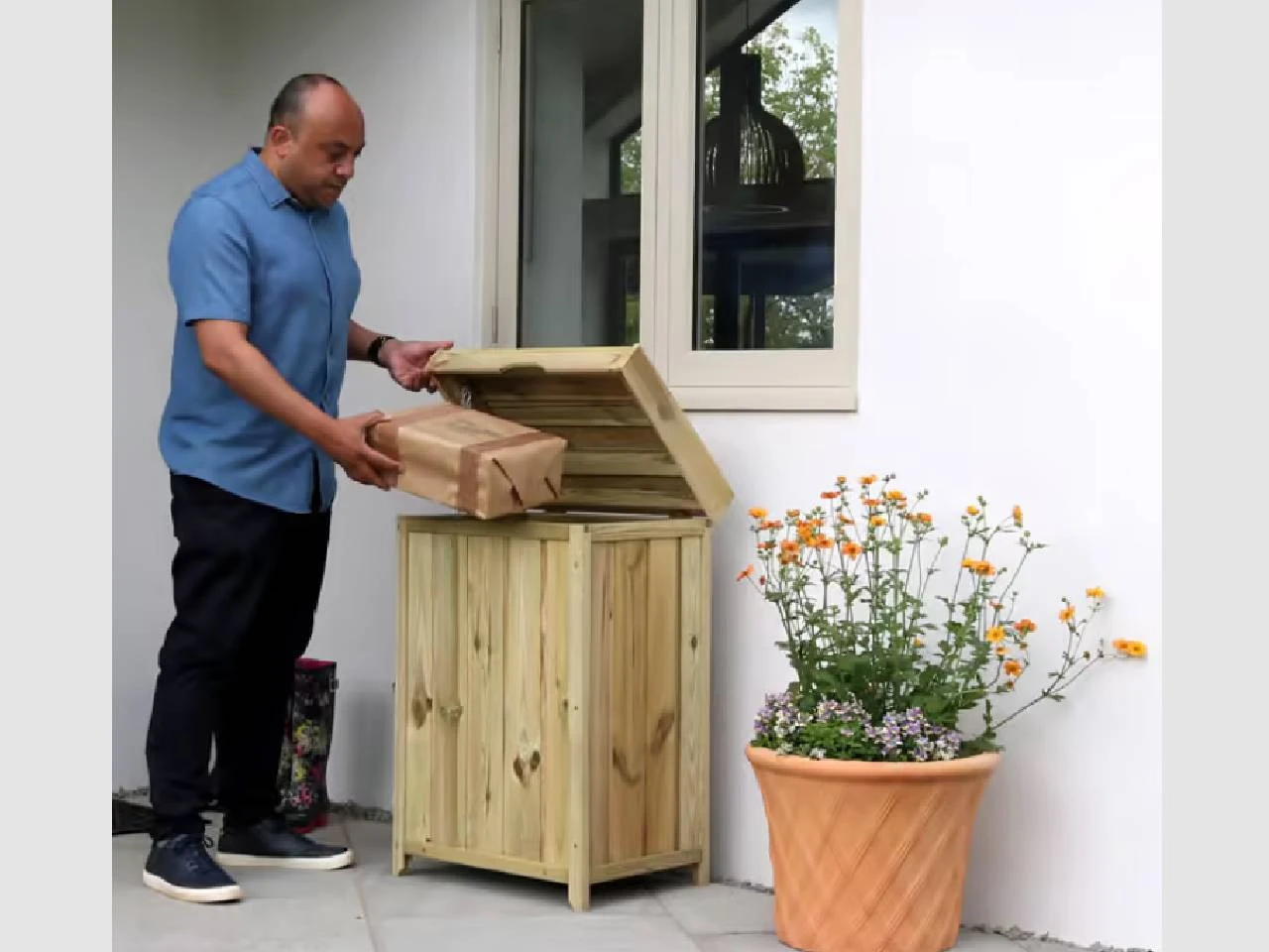 The Keep Safe Parcel Store is designed for secure storage outside of your home. Parcels or deliveries can be placed on a hinged platform just inside the lid. When the lid is closed, they will drop down into a secure space underneath. They can then be collected via access through a side door, which can be fitted to either side of the wooden store.